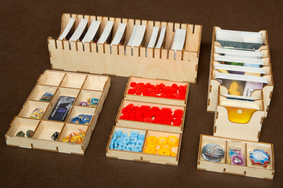 - zasuwane pojemniki na żetony i zasoby pozwalają przechowywać pudełko w pionie.