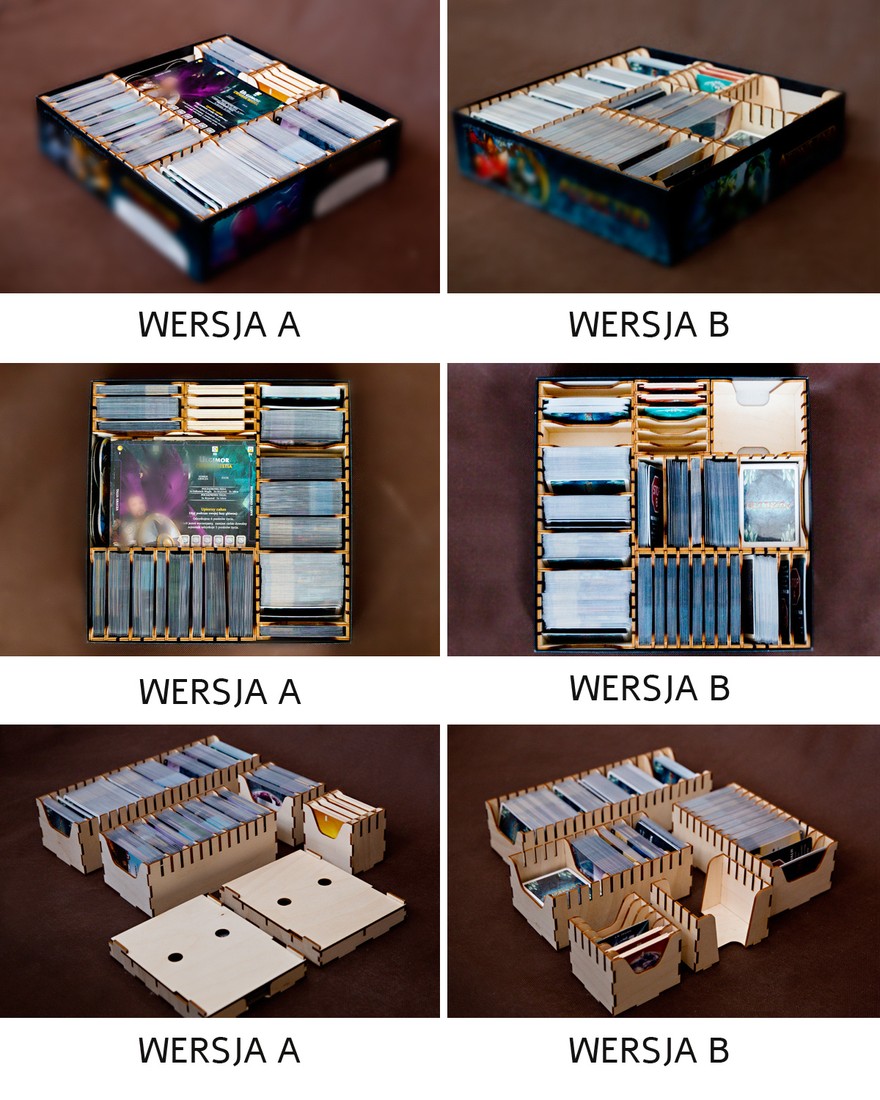 Wersja A jest przeznaczona jako pierwszy insert do Waszej piewszej podstawki do tej gry (Aeons End / Aeons End Wieczna Wojna / Aeons End Nowy Początek). Wersja A oprócz pojemników na karty i pojemnika na bramy zawiera dwa pojemniki na żetony, które mieszczą żetony dwóch podstawek (Aeons End lub Aeons End Wieczna Wojna) oraz pięciu dodatków (Czeluście, Bezimienni, Otchłań, Niezbadany Mrok, Pogrzebane Sekrety). Zmieszczą się również w tej wersji karty wszystkich bohaterów i wszystkich Nemesis z wyżej wymienionych podstawek i dodatków. Pojemniki na żetony są zasuwane - nic się nie wysypie przy ułożeniu pudełka w pionie. Do zorganizowania kolejnej podstawki Aeons End Nowy Początek możesz potrzebować kolejnego insertu w wersji A.