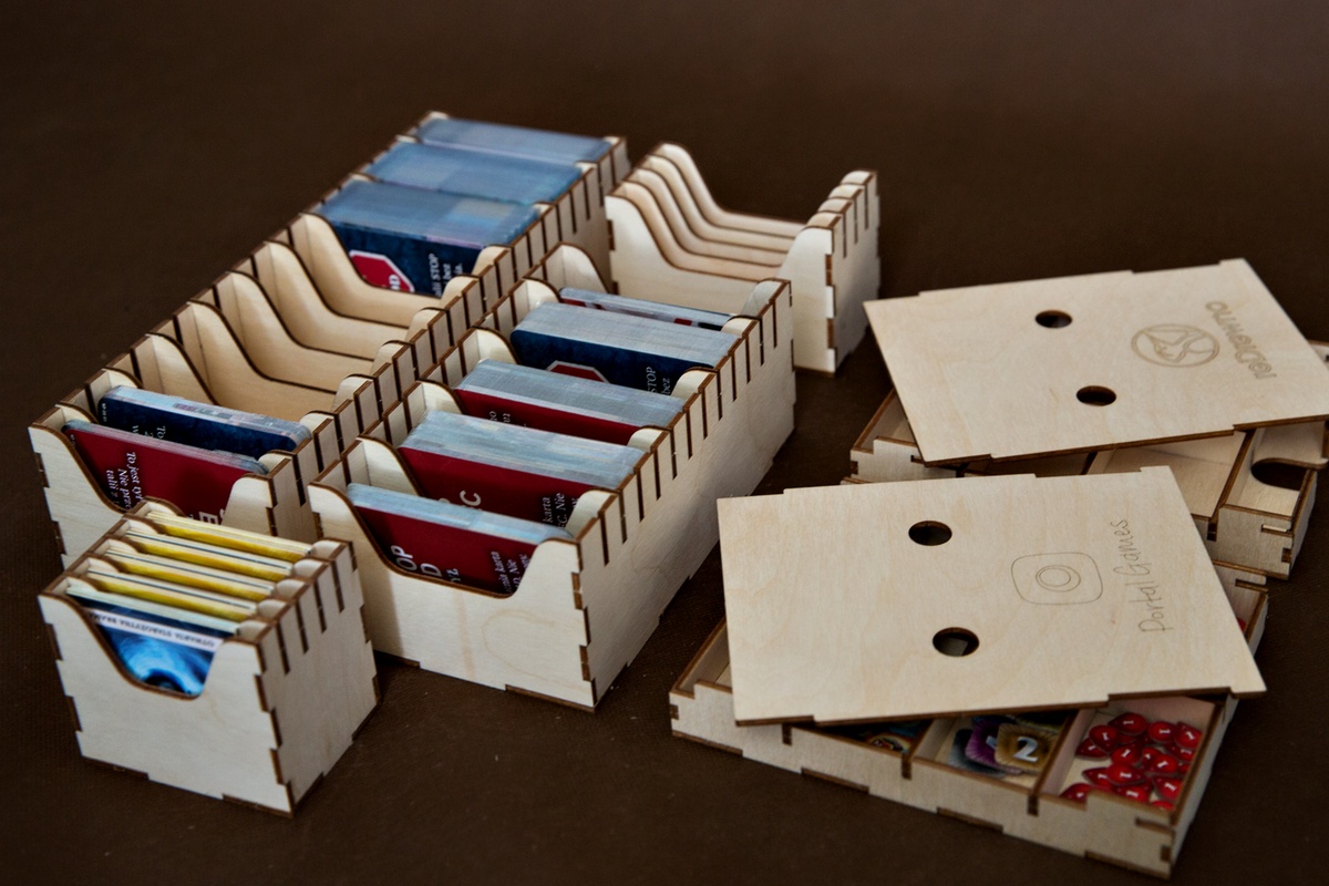 - zasuwane pojemniki na żetony i zasoby pozwalają przechowywać pudełko w pionie.