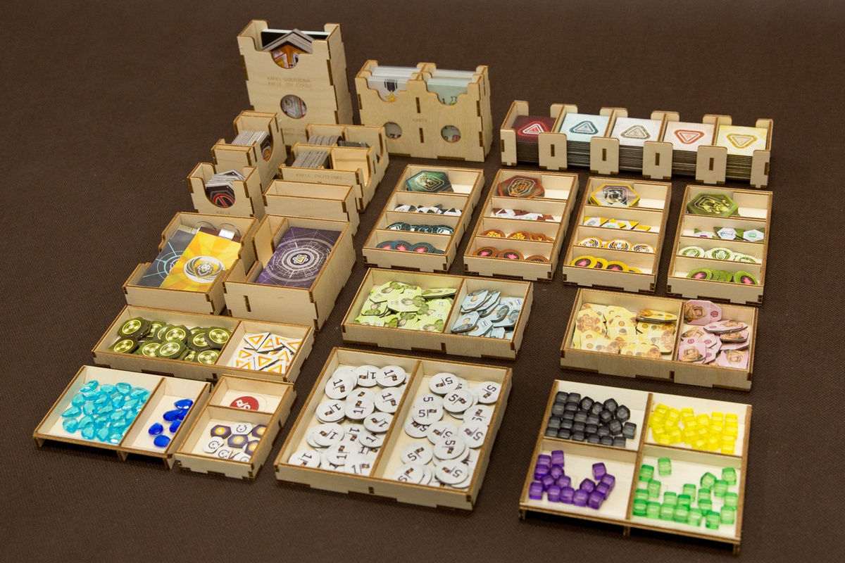 Insert zawiera pojemniki do wyłożenia na stół, które ułatwiają rozgrywkę i pomagają utrzymać porządek: