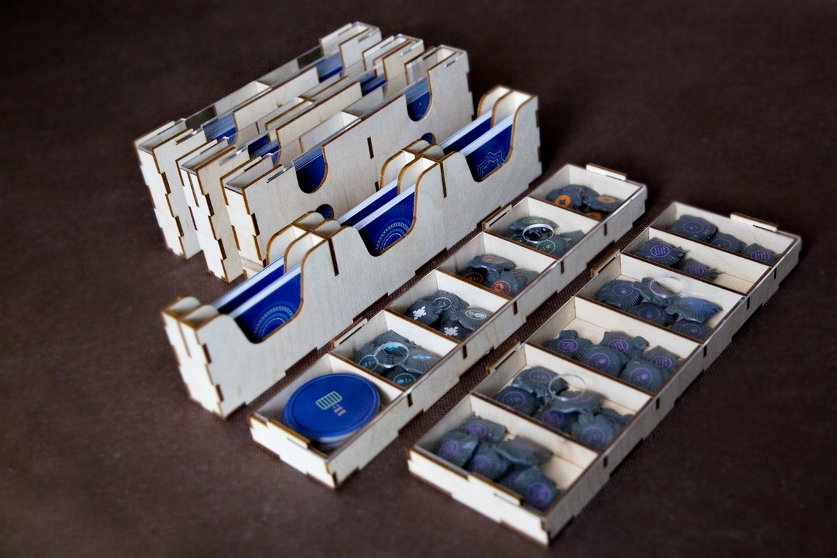 Trzy poziome zasuwane pojemniki pozwalają na przechowywanie posegregowanych tali początkowych graczy (5 talii), talię kart Królów, 2 talie Postaci Oceanu. Jeden pionowy pojemnik pozwala na przechowywanie podzielownych talii Lokacji oraz talię kart Plemion. Dwa zasuwane pojemniki mieszczą posegregowane figurki Wyszkolonych Mant dla graczy, posegregowane rodzajami figurki Dzikich Mant oraz żetony Celów.