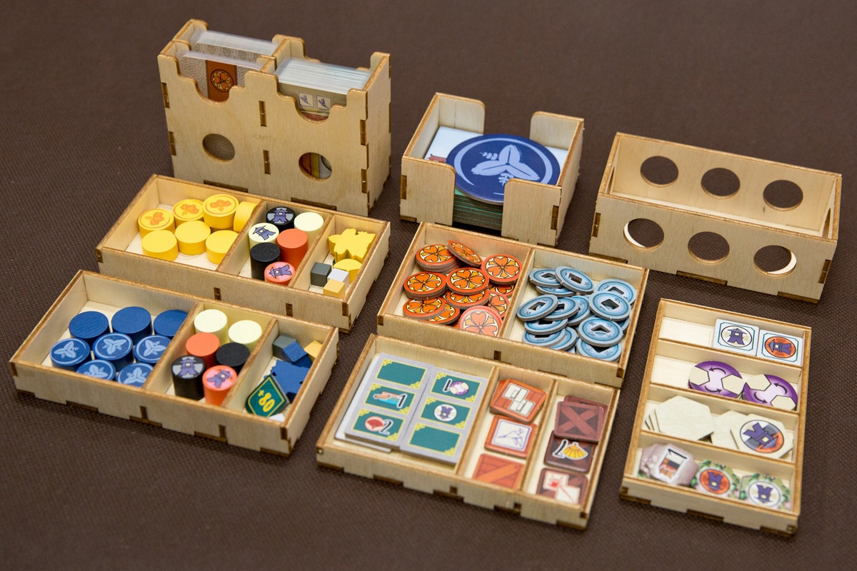 - 2 pojemniki na komponenty dla każdego z Graczy: Pieczęcie Klanu, Dworzanin, żeton +40/+80 oraz znaczniki Latarni, Punktów Klanu, Zasobów,