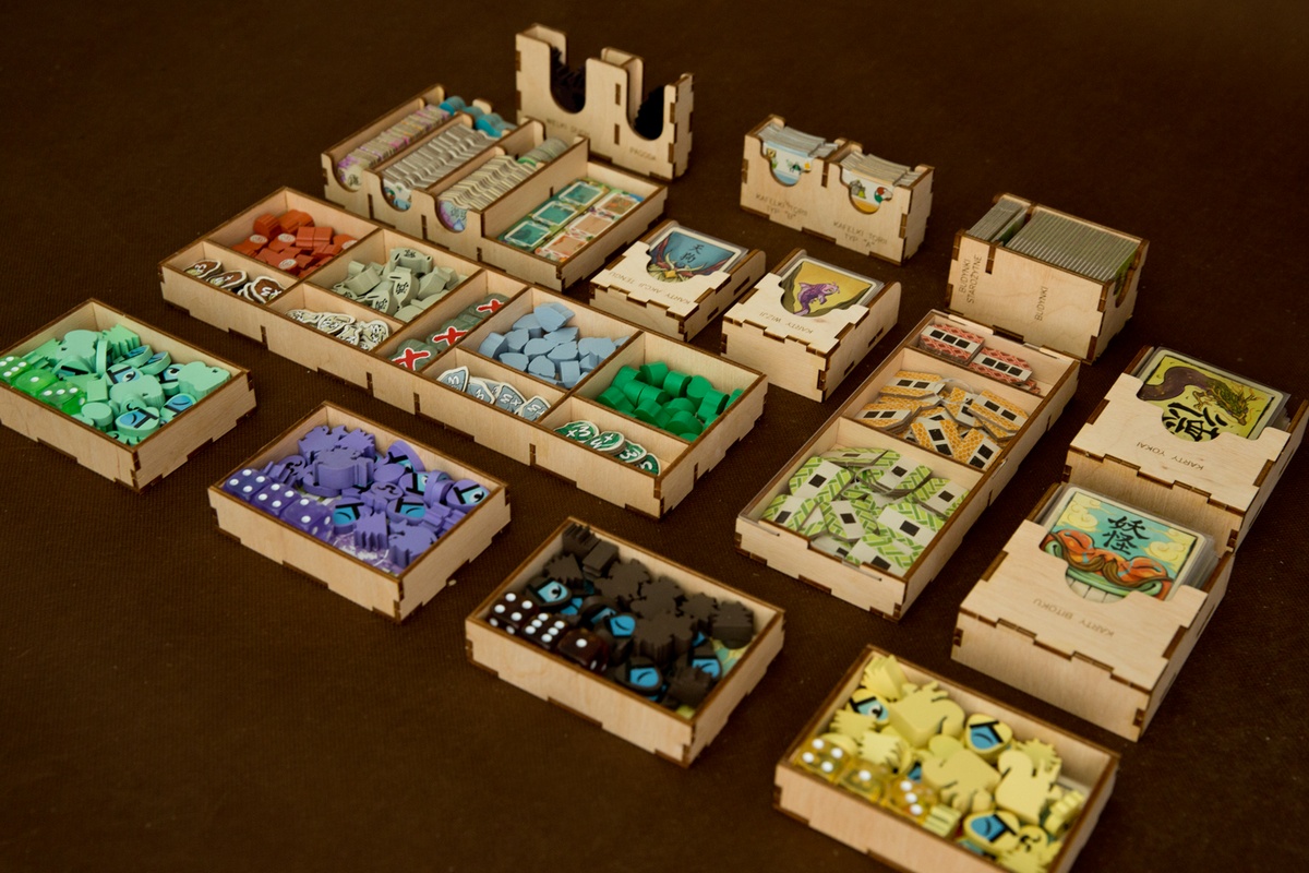 - pojemniki na komponenty dla każdego z Graczy mieszczą: początkowe karty Yokai, Chorągwie, kości, znaczniki Gracza, Kodam, Pielgrzymów, Budynków, początkowe zasoby (1x Jadei, 1x Amulet +1, 1x Drewno),