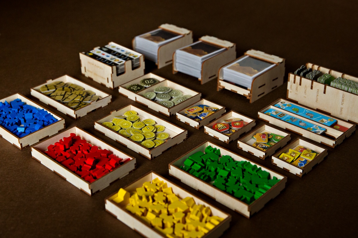 - pojemniki na karty, żetony i znaczniki pomagają utrzymać ład na stole,