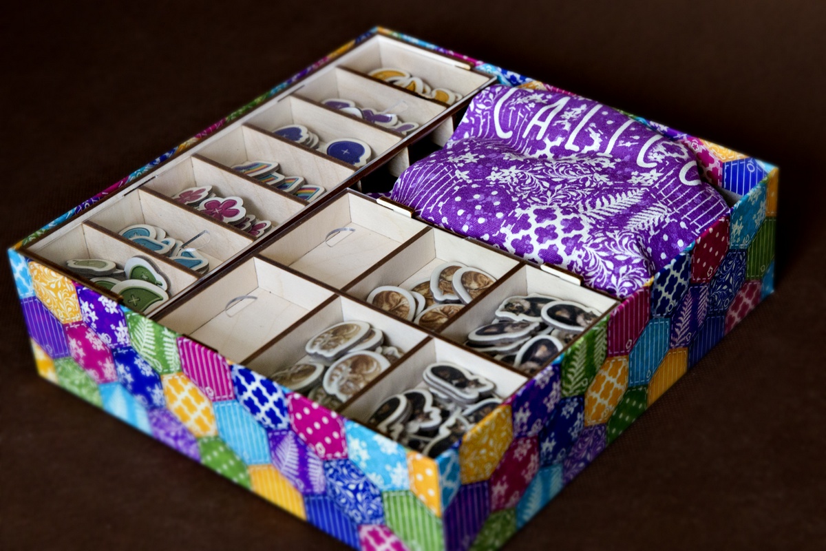 Oferta obejmuje insert pasujący do gry Calico wraz z promką z wersji kickstarter. Na zdjęciach przedstawiono przykładowe zastosowanie dla gry podstawowej bez wyżej wymienionej promki.