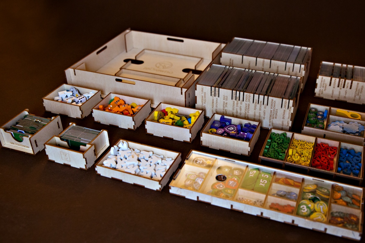 - Część A - pojemników wchodzących do pudełka z grą pozwalających na organizacje wszystkich kart, żetonów i znaczników.