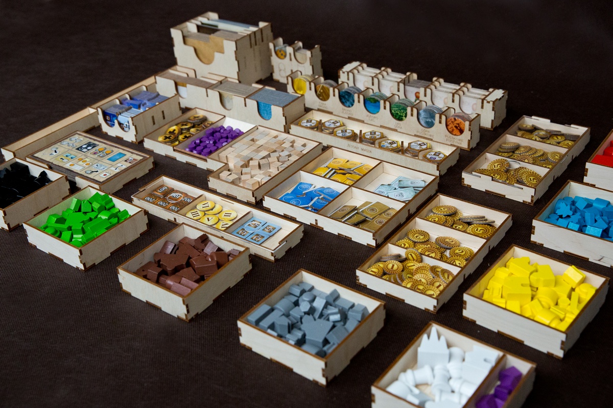 Pojemniki w insercie posiadają grawery ułatwiające posegregowanie elementów. Pojemniki z drobnymi żetonami są zasuwane co pozwala na pionowe przechowywanie pudełka. Insert zawiera szereg pojemników oraz podajników na żetony do wyłożenia na stół w celu organizacji przestrzeni i utrzymania porządku w trakcie rozgrywki.