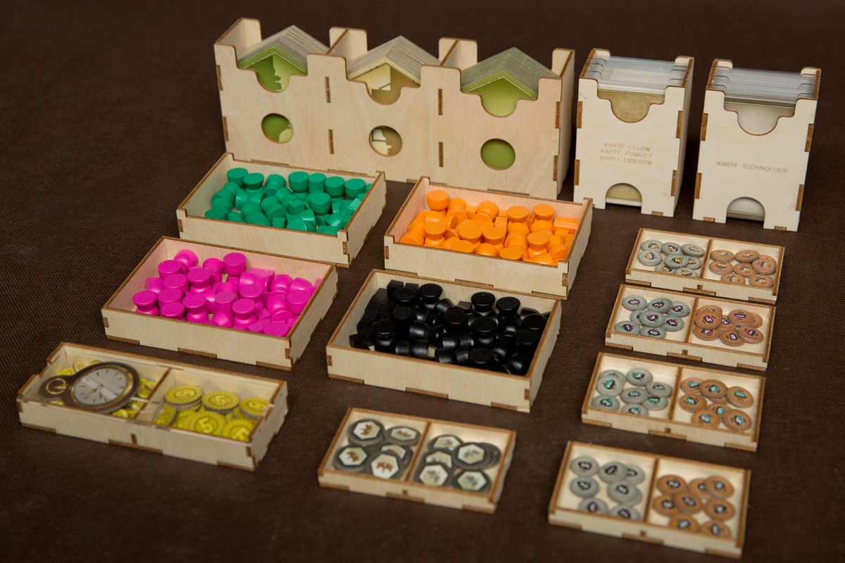 - pojemniki na żetony stanowią gotowe tacki do wyłożenia na planszę i zapobiegają rozsypywaniu się stosów ułożonych żetonów,