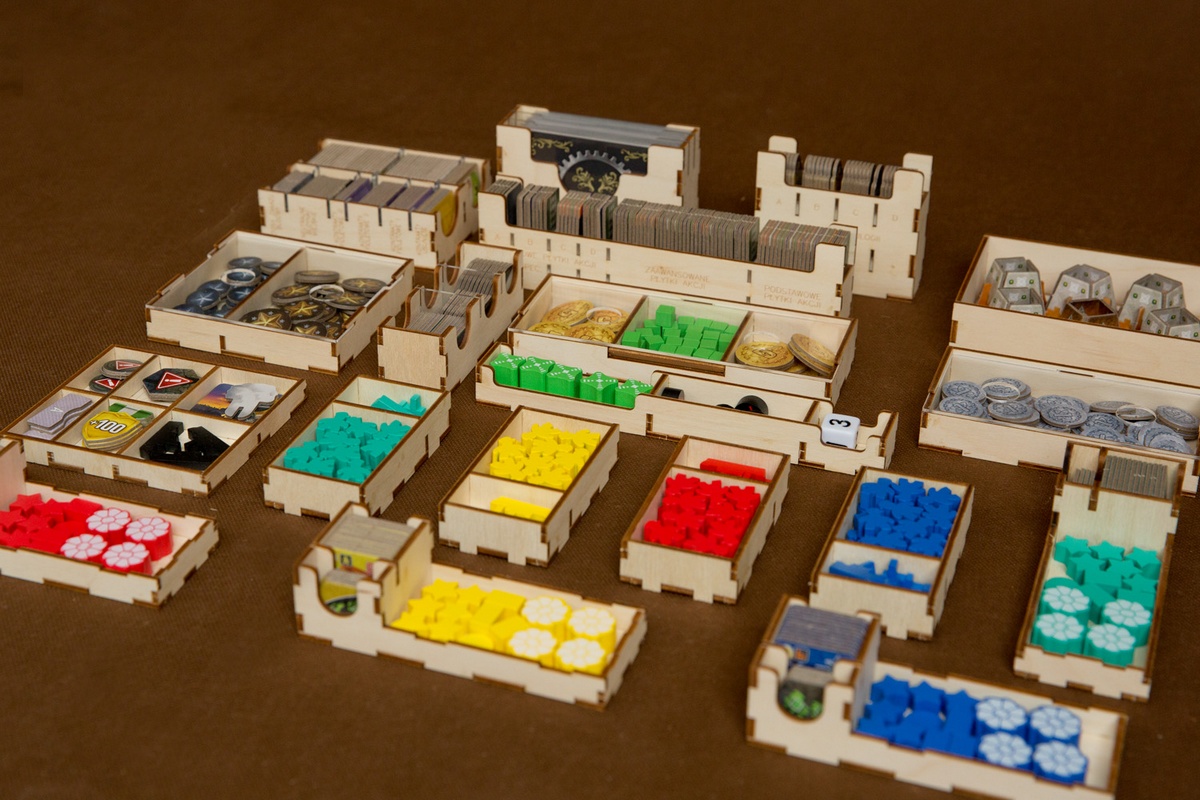 Insert zawiera pojemniki do wyłożenia na stół, które ułatwiają rozgrywkę i pomagają utrzymać porządek: