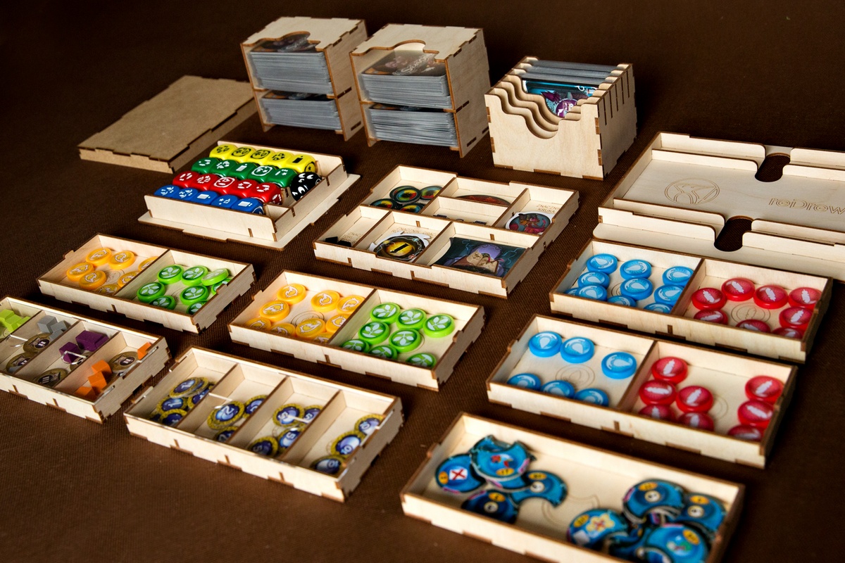 - pojemniki na karty, żetony i znaczniki pomagają utrzymać ład na stole,