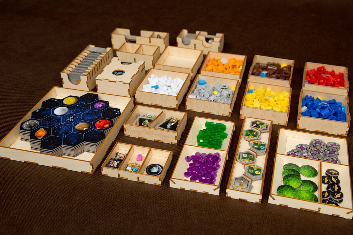 - 7 pojemników dla każdej z Frakcji mieszczące: 8 Kopalń, 4 Placówki Handlowe, 3 Laboratoria, 2 Akademie, 1 Instytut Planetarny, 3 Gajaformery, 7 znaczników Gracza, 25 Satelitów, 2 znaczniki Kredytów, 1 znacznik Rundy, 1 znacznik Wiedzy,