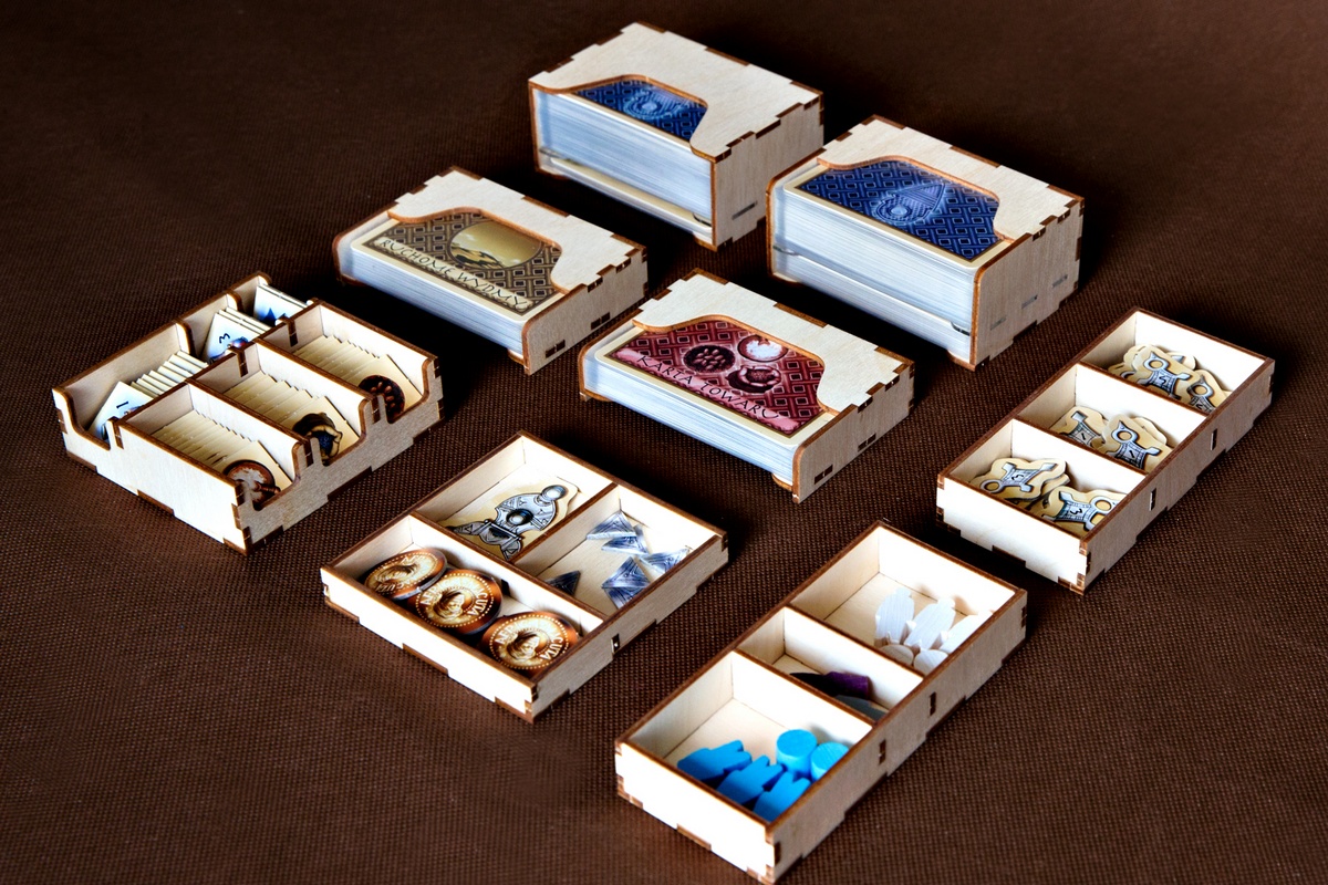 Pojemniki na karty i pojemniki na żetony jednocześnie pełnią funkcję podajników - przyspiesza to przygotowanie gry do rozgrywki i jej złożenie jednocześnie pozwalając zachować porządek na stole i w pudełku.