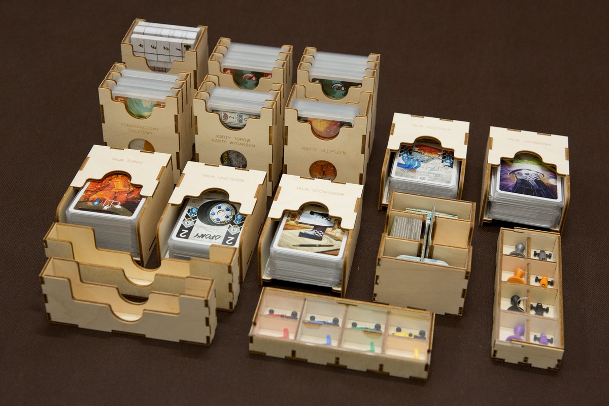 Insert pasujący do gry TURBO z dodatkami W strugach deszczu oraz Widzenie tunelowe. Insert pomieści karty w koszulkach klasy Premium o grubości do 100 mikronów. Na zdjęciach karty w koszulkach Rebel Standard USA Premium - CRATER (polecamy te koszulki).Pojemniki na karty Turbo, Obciążenia, Sponsorów, Ulepszeń stanowią jednocześnie podajniki na karty (pojemniki mają dna pod kątem co zapobiega wysuwaniu się kart ze stosu podczas ich pobierania). Pojemniki w insercie posiadają grawery ułatwiające posegregowanie elementów.