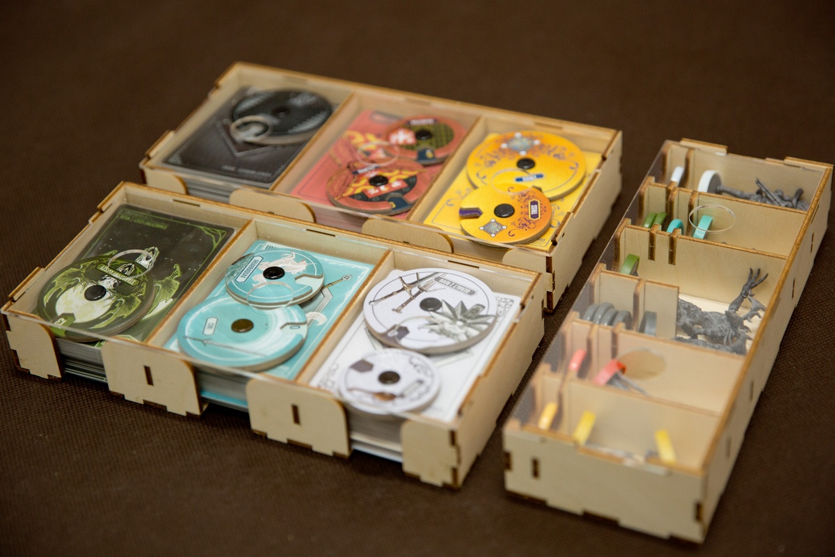 - podajnik na karty oraz pojemniki na pomocników i figurki posiadają zasuwki z pleksi – takie rozwiązanie pozwala utrzymać porządek w pudełku podczas transportu,