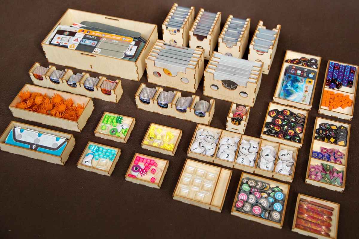 - pojemniki na karty dzielą je wg rodzajów, dodatkowo 2 małe pojemniki na karty pozwalają na podzielenie kart Upadłych Rodów Pochodzenia, Technologii wg Rodów, co znacząco pozwala skrócić przygotowanie rozgrywki,