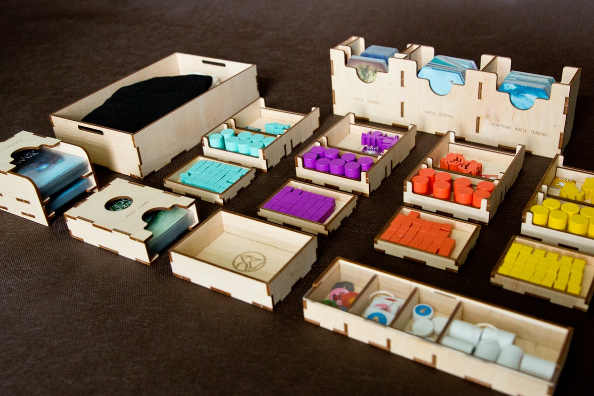 - pojemnik na planszetki Graczy oraz woreczki z żetonami posiada grawer obrazujący rozłożenie żetonów zasobów (grafiki są zakrywane na planszy kaflami i ich nie widać) co ułatwia przygotowanie rozgrywki bez zaglądania do instrukcji,