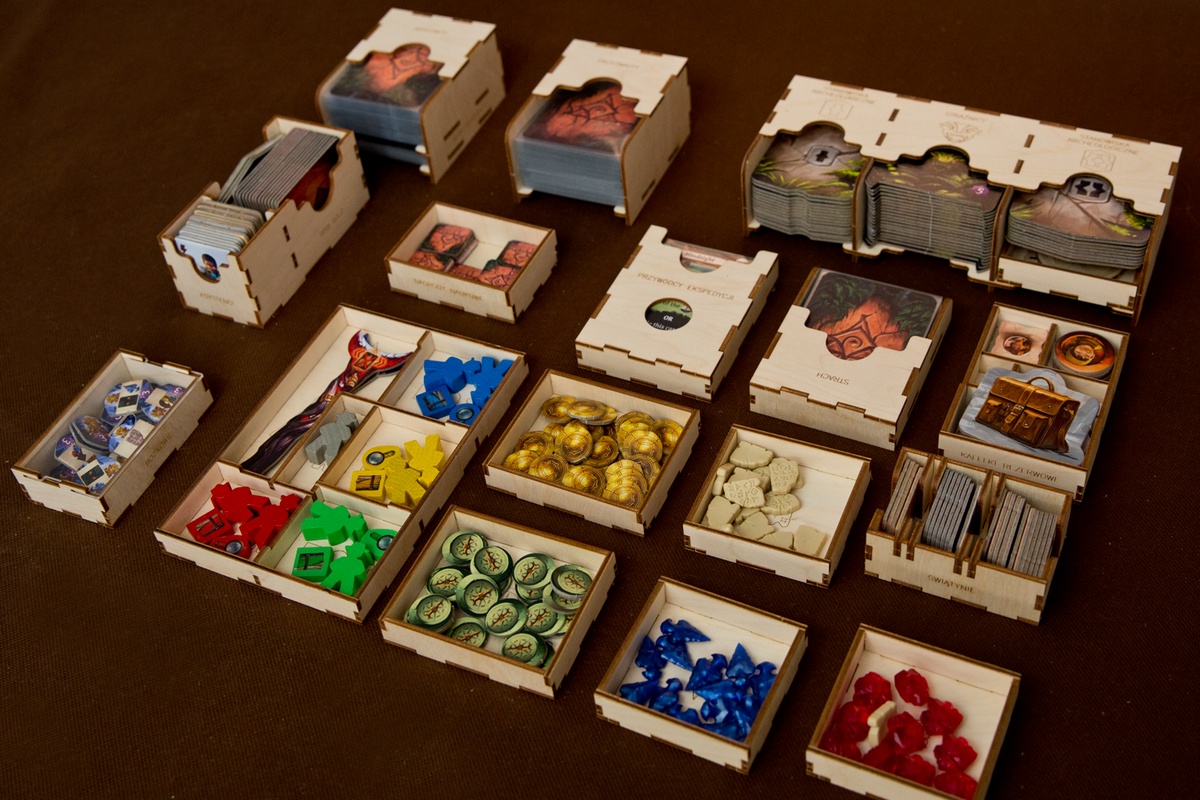 - pojemniki na karty i kafelki wykładane na planszę stanowią podajniki i zapobiegają rozpadaniu się stosów podczas rozgrywki,