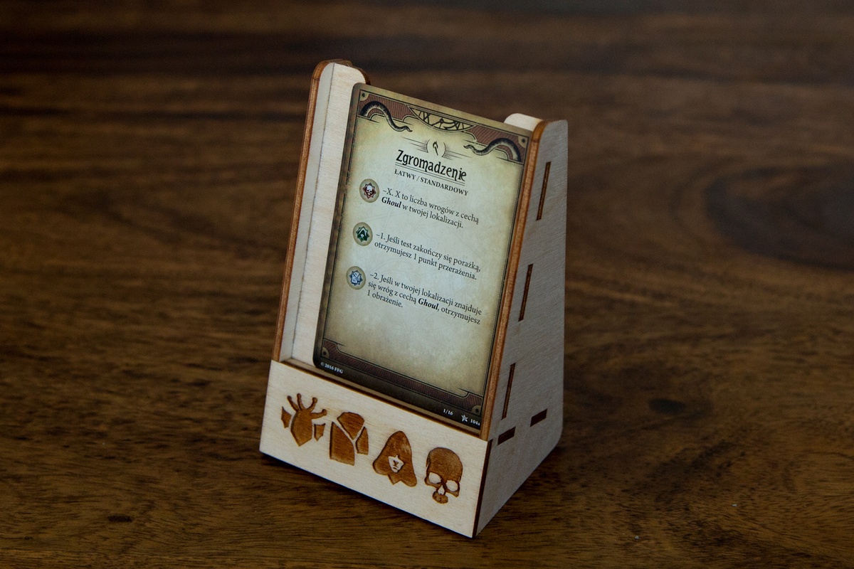 Grawerowana podstawka na kartę scenariusza / pomocy pasująca klimatem do gier "Cthulhu" np. Horror w Arkham LCG. Pasuje do kart Standard CCG (63,5x88 mm). Dno podstawki wykonane pod kątem co zapobiega przypadkowemu wypadaniu karty.