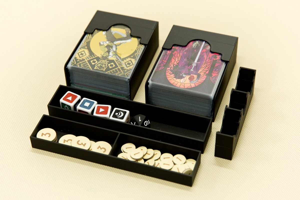 Insert pasujący do gier z serii Kinfire Delve: Zagroda Pogardy / Grota Próżności / Laboratorium Bezdusznego. Insert mieści karty w koszulkach premium do 100 mikronów. Insert umożliwia przechowywanie do 4 "diali" liczników o średnicy 30 mm i grubości 6 mm.
