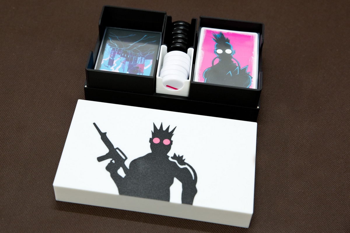 Pojemnik pasujący do gry Radlands z dodatkiem Cult of Chrome. Zastępuje on oryginalny pojemnik, który nie mieści kart w koszulkach.